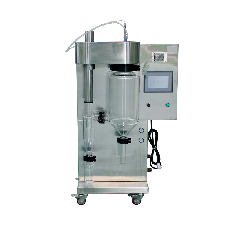 小型噴霧干燥機是液體成形工藝和干燥工業中最廣泛應用的工藝,其為連續式常壓干燥器的一種,具有傳熱快,水分蒸發迅速,干燥時間瞬間的特點,且制品質量好,溶解性能也好,能改善某些制劑的溶出速率,最適用于從溶液、乳液、懸浮液和糊狀液體原料中生產粉狀、顆粒狀固體產品,因此當成品的顆粒大小分布、殘留水分含量、堆積密度和顆粒形狀都符合精確的標準時,噴霧干燥機就是十分理想的干燥設備。